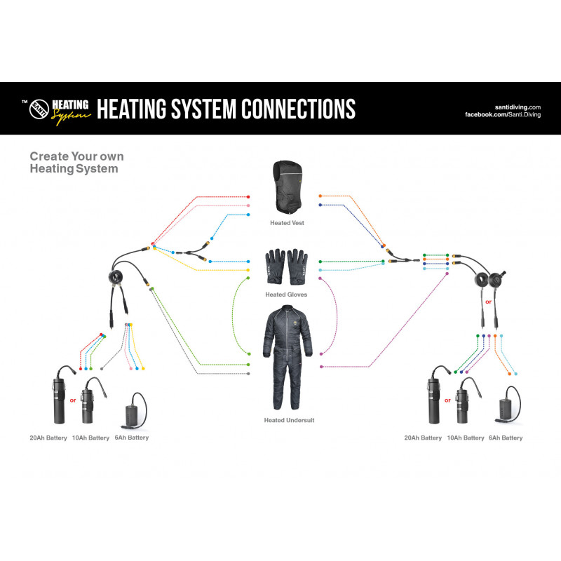Du har brug for en indblæsningsventil med ledningsføring på din tørdragt og et canister batteri for tilslutning af inderdragten. Hvis du allerede bruger Santi el-varme vesten eller el-varme handskerne så er der integreret ledningsføring til det i inderdragten.
